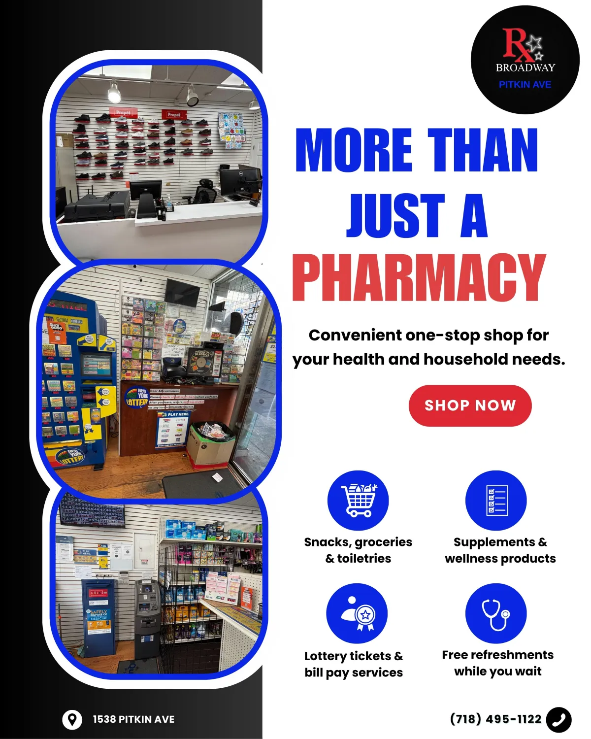 Beyond medications, Broadway Pharmacy offers snacks, groceries, toiletries, and daily essentials at our Brooklyn convenience store. Located on Pitkin Ave in Brownsville, we’re your one-stop shop for healthcare and household needs — all with friendly neighborhood service.